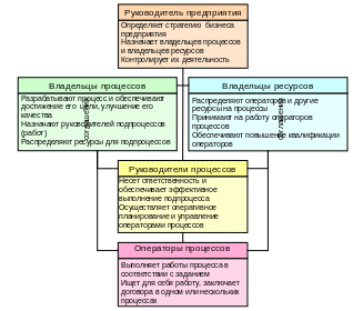 Очевидно, что принципы управления предприятия, полностью реализовавшем процессный подход, заметно отличаются от принципов управления традиционной организацией, что накладывает новые требования на схему отношений между подразделениями и приводит к перераспределению обязанностей. На таком предприятии можно выделить несколько типовых функциональных ролей сотрудников: владельцы процессов, владельцы ресурсов, руководители процессов и операторы процессов (Рисунок 4 .19) [ 15 ].