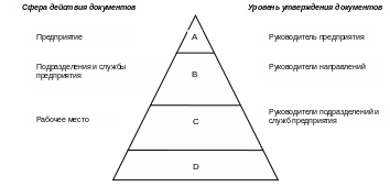 По сфере действия вся документация системы менеджмента качества подразделяется на основную (уровень А), общую (уровень В), специальную (уровень С) и записи о качестве (уровень D) (Рисунок 4 .23).