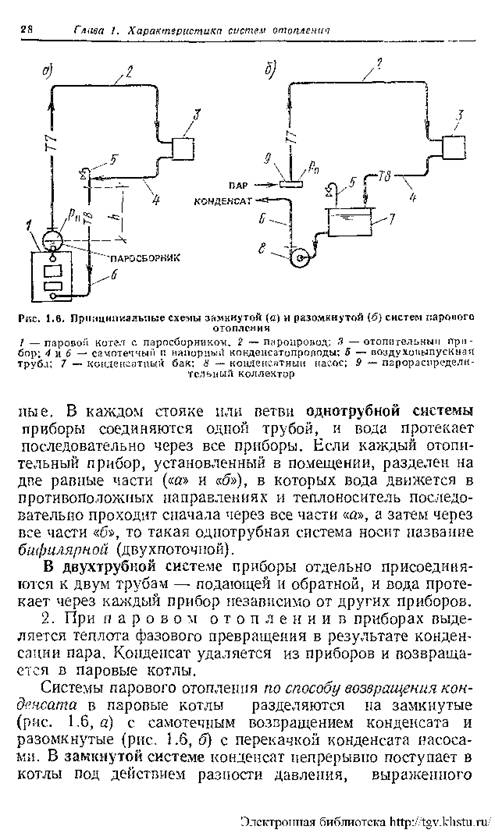 Системы парового отопления по способу возвращения конденсата в паровые котлы разделяются на замкнутые (рис. 1.6, а) с самотечным возвращением конденсата и разомкнутые (рис. 1.6, б) с перекачкой конденсата насосами.