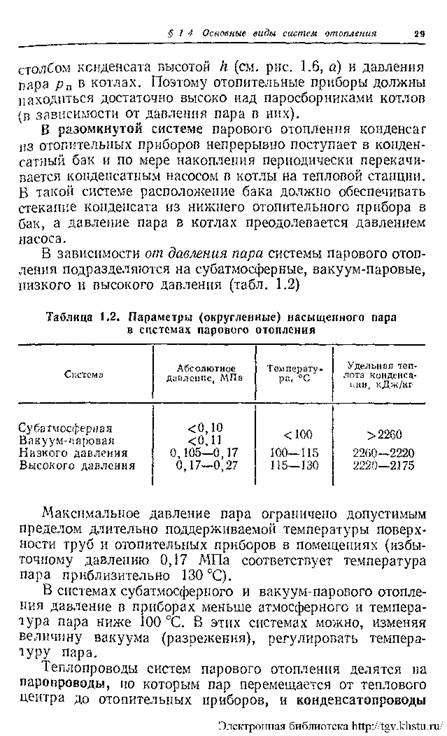 Таблица 1. Параметры (округленные) насыщенного пара в системах парового отопления
