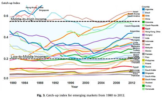 Рисунок 2. Значения Catch-up индекса развивающихся рынков с 1980