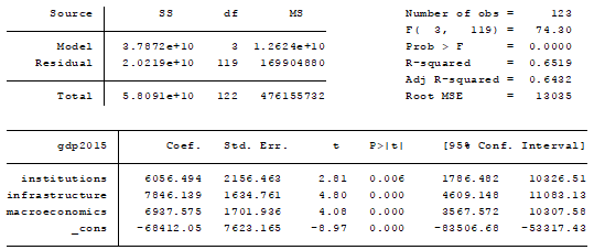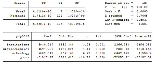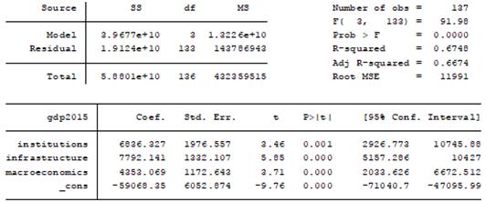 Согласно данной модели получим следующее уравнение: y= -68412,05+6056,49*x1+7846,14*x2+6937,58*x3, где x1 - институты, x2 - инфраструктура, x3 - макроэкономическая среда.