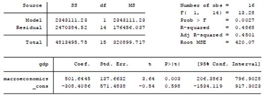 Что касается второй полученной модели, то здесь объясняющей переменной является макроэкономическая среда, что также является логичным объяснением влияния на рост ВВП в силу того, что благоприятные экономические условия рынка являются базовым фактором для развития экономики (Рисунок 13). Однако стоит отметить, что в обеих моделях достаточно низкий показатель нормированного R-квадрата (0,38 и 0,45), что говорит о наличии других факторов, также влияющих на рост ВВП.