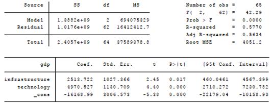 следующим образом: y=-16169+2513,7*x1+4970,5*x2, где x1 - инфраструктура, x2 -