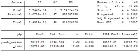 Таким образом, представляется логичным, что такой фактор оказывает влияние на экономический рост в странах с высоким уровнем доходов. Однако стоит отметить невысокий уровень значения нормированного R-квадрата модели (0,3), что может говорить о том, что, очевидно, в действительности на рост ВВП (ППС) на душу населения оказывает влияние гораздо большее количество факторов, некоторые из рассмотренных в рейтинге не могут быть учтены в модели по причине мультиколлинеарности. При этом среди всех параметров рейтинга, эффективность товарного рынка оказывает наибольшее влияние на рост ВВП.