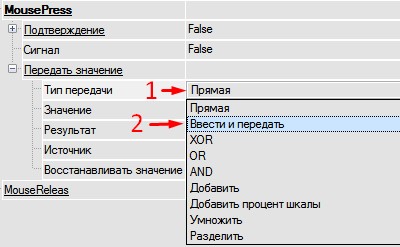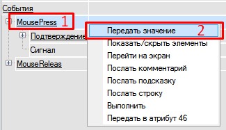 Аз зери он ба навиштаҷоти “MousePress” тугмаи рости мушакро зер намуда, дар менюи пайдошуда ба тугмаи “Передать значение”-ро интихоб менамоем.