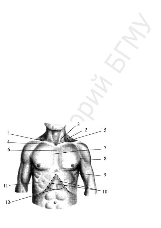 1 — ключица; 2 — большая надключичная ямка; 3 — малая надключичная ямка; 4 — подключичная ямка; 5 — яремная вырезка рукоятки грудины; 6 — грудина; 7 — угол грудины; 8 — подмышечная ямка; 9 — межреберья; 10 — реберные дуги; 11 — ребра; 12 — подгрудинный угол