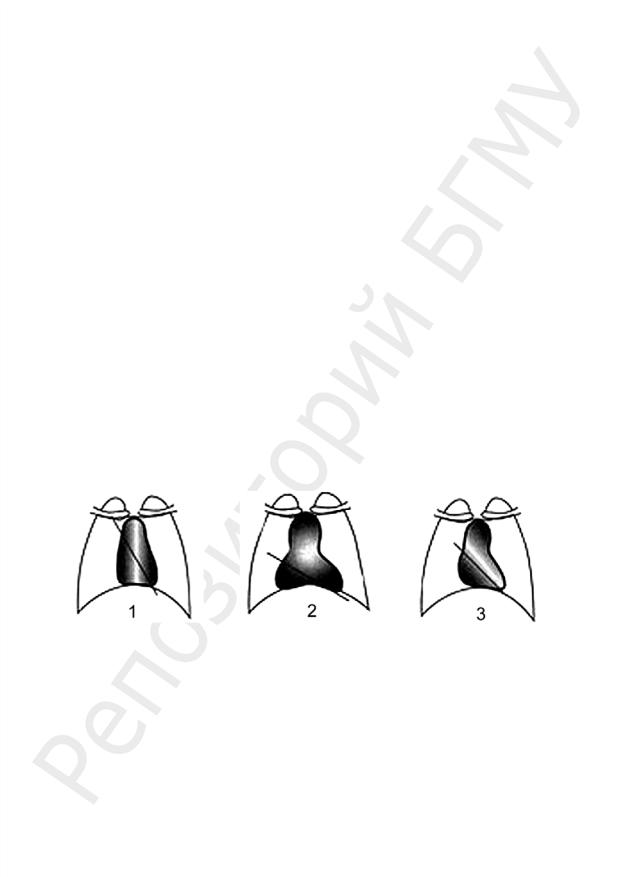 Рентгенологически выделяют три основных варианта расположения сердца (рис. 9): вертикальное, горизонтальное и косое. Эти варианты связаны с конституциональными особенностями организма. У лиц с гиперстеническим (брахиморфным) типом телосложения чаще наблюдают горизонтальное положение сердца, у астеников (долихоморфный тип) сердце занимает вертикальное положение, у лиц нормостенической конституции (мезоморфный тип) — расположено в косом направлении.