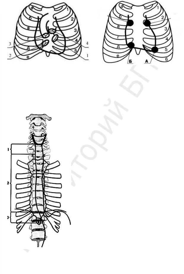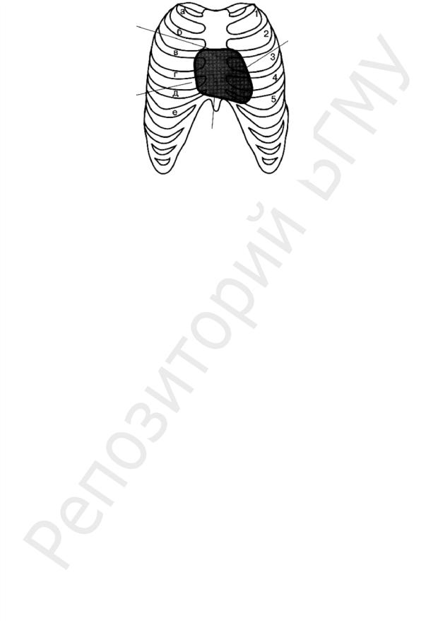 Рис. 10. Проекция сердца на переднюю стенку грудной клетки (пояснения см. в тексте)