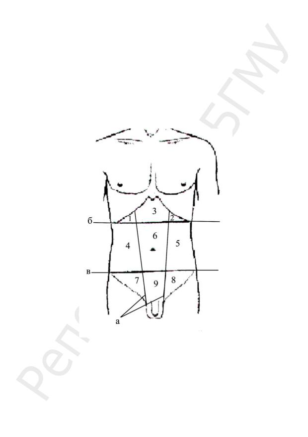 а — вертикальные линии; б — подреберная плоскость; в — межостевая плоскость: 1 — правое подреберье, правая подреберная область (hypochondrium dextrum, regio hypochondriaca dextra); 2 — левое подреберье, левая подреберная область (hypochondrium sinistrum, regio hypochondriaca sinistra); 3 — надчревье, надчревная область, надчревная ямка (epigastrium, regio epigastrica, fossa epigastrica); 4 — правая боковая область (regio lateralis dextra); 5 — левая боковая область (regio lateralis sinistra); 6 — пупочная область (regio umbilicalis); 7 — правая паховая область (regio inguinalis dextra); 8 — левая паховая область (regio inguinalis sinistra); 9 — подчревье, лобковая область (hypogastrium, regio pubica)