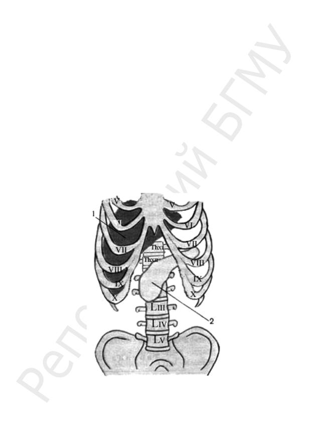 Рис. 18. Скелетотопия печени и поджелудочной железы