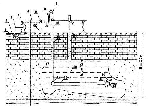 - водоём; 2 - всас; 3 - подводящий трубопровод; 4 - центробежный насос; 5 - напорный трубопровод; 6 - задвижка; 7 - сбросная задвижка; 9 - верхнее колено; 10 - вертикальный став гидромонитора; 14 - центральная насадка; 15 - боковые насадки; 16 - эрлифт; 17 - добычная камера; 18 - скважина гидромонитора; 19 - скважина эрлифта.