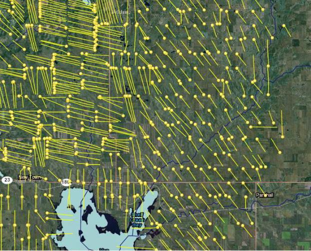Рис. 2. Карта участка месторождения Баккен с расположением забоев пробуренных скважин