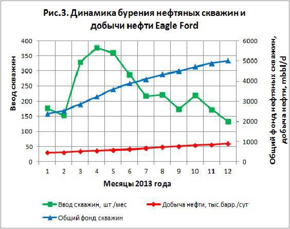 Темпы разбуривания Eagle Ford поражают. Такого в мире еще не было. В позапрошлом году на месторождении работало 266 буровых станков, это 10 % всех буровых установок планеты. Только за прошлый год количество пробуренных скважин выросло более чем в 2 раза, до 7509 шт. (рис. 3) и почти так же выросла добыча нефти.