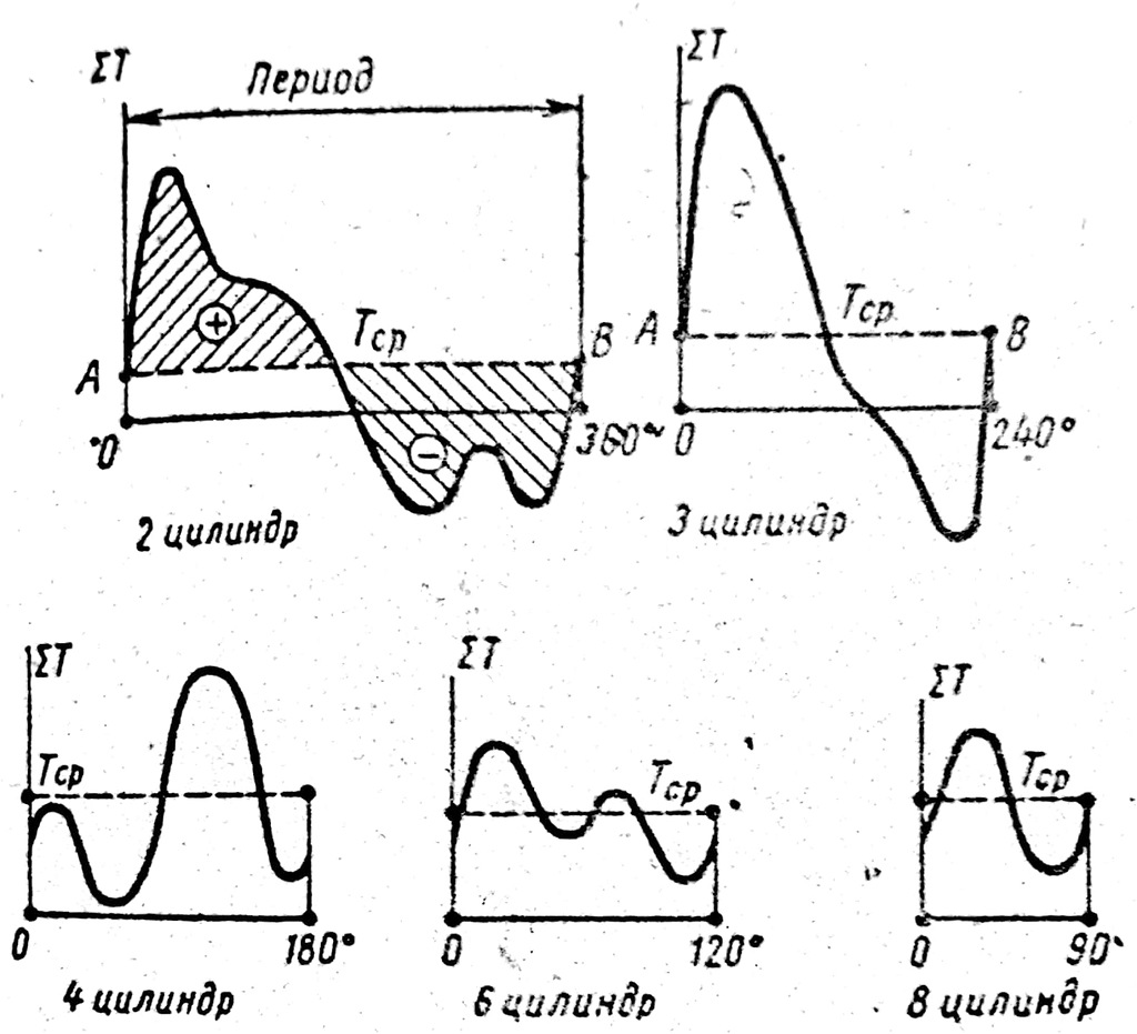 Изменение касательного усилия многоцилиндрового двигателя представляется суммарной диаграммой касательных усилий, которая длявсех цилиндров может быть построена путем суммирования ординат кривых касательных усилий от всех цилиндров, сдвинутых по отношению один к другому на угол заклинки кривошипов φ0, который определяется по формуле: