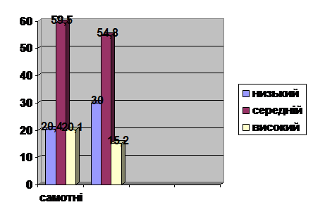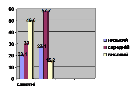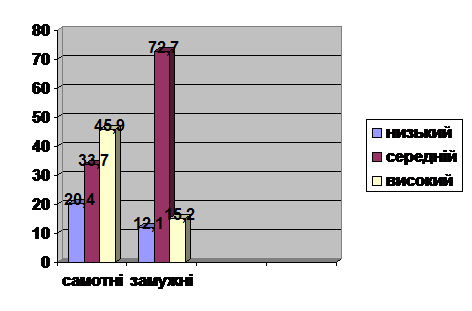 З представленого рисунка ми можемо зробити висновок, що більшість самотніх жінок мають високий рівень ситуативної тривожності (49,6 %), що свідчить про те що такі жінки схильні до тривоги при різноманітних нескладних ситуаціях. У замужніх жінок домінує середній рівень ситуативної тривожності, тобто вони розуміють, що необхідно вирішувати ті проблеми, що виникають на життєвому шляху, але розуміють, що вони колись обов’язково вирішаться.