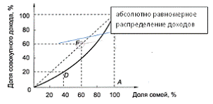 В точке F, лежащей на биссектрисе угла, наблюдается абсолютно равномерное распределение доходов: 60 % семей получают 60 % созданного совокупного дохода. Чем сильнее отклонение кривой Лоренца от линии абсолютного равенства ОЕ, тем более неравномерно распределены в обществе доходы.