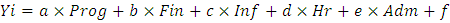 где Yi - индикаторы развития предпринимательства, Prog - оценка качества программы по поддержке малого и среднего предпринимательства в регионе, Fin - оценка финансового климата, Inf - оценка инфраструктуры в регионе, Hr - оценка людских ресурсов и рынка труда в регионе, Adm - оценка административной безопасности в регионе, a, b, c, d, e - коэффициенты перед факторами социально-экономического развития, f - свободный член.