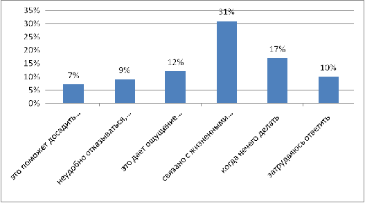 На вопрос «слышали ли Вы, что кто-то из сверстников употребляет наркотики» - 80% (24 человека) опрошенных ответили утвердительно, 20% (6 человек) - отрицательно. А на вопрос «как ты думаешь, почему может возникнуть желание попробовать наркотик?» - 14 % (5 человек) ответили, что это поднимает авторитет в глазах других ребят; это поможет досадить родителям ответило 7 % (2 человека); 9 % (3 человека) - неудобно отказываться, когда все пробуют; 12 % (4 человека) ответили, что это дает ощущение самостоятельности и независимости; 31 % (8 человек) сказали, что это связано с жизненными обстоятельствами; когда нечего делать 17 % (5 человек) и ответ затрудняюсь ответить дали 10 % (3 человека) (рис.2.1.4).