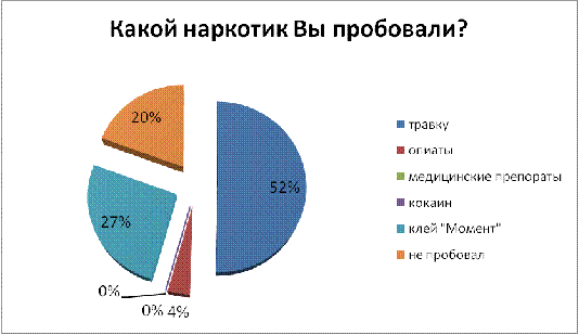 На вопрос «довелось тебе хотя бы раз попробовать наркотик?» 73% (21 человек) опрошенных ответили - «да», 22% (5 человек)- «нет» и 5% (5 человек) - затруднились ответить на данный вопрос.