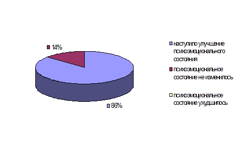 В результате наблюдения за поведением и психоэмоциональным состоянием детей во время и после посещения ими сенсорной комнаты, было определенно, что у 86 процентов детей из группы наблюдалось улучшение в психоэмоциональном состоянии. У детей снижалось нервное возбуждение, агрессия, беспокойство. Достигалась нормализация сна, снижался уровень тревожности. У оставшейся части детей в группе (14 %) психоэмоциональное состояние не изменялось, оставаясь прежним. Ухудшений в психоэмоциональном состоянии у детей в процессе посещения сенсорной комнаты не наблюдалось.