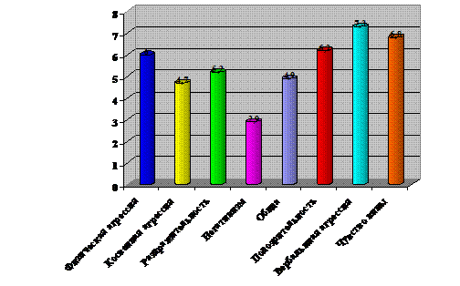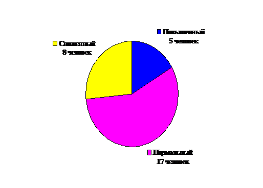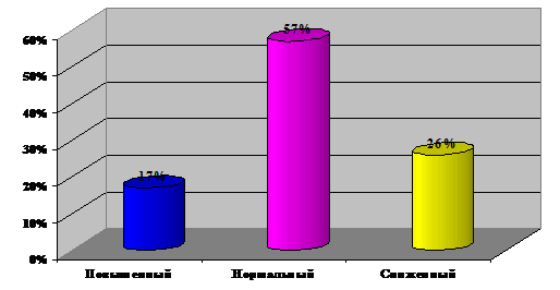 Таким образом, можно утверждать, что учащихся со сниженным уровнем агрессивности 8 человек - 26%, с нормальным уровнем агрессии 17 человек, что составляет 57% от общей выборки учащихся, и наконец с повышенным уровнем агрессивности в данной выборке 5 человек, что составляет 17% от всего количества испытуемых.
