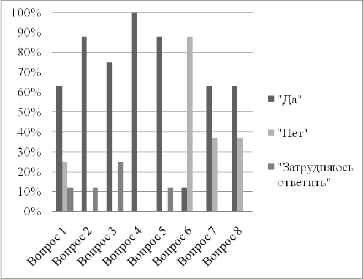 По результатам, полученным после проведения анкетирования, выявлено: 63% опрошенных отметили, что им нравиться занимаемая ими должность, 25% не согласились и 12% затруднились ответить на вопрос; 88% считают, что у них есть все необходимые материалы и оборудование для выполнения качественной работы, остальные 12% выбрали вариант «Затрудняюсь ответить»; 75% опрошенных утверждают, что часто проявляют инициативу в работе, 25% затруднились ответить на вопрос; у 100% хорошие взаимоотношения с коллегами; 88% отметили, что их устраивает отношение к себе начальства, 12% написали «Затрудняюсь ответить»; на вопрос о запугивании со стороны начальства 88% ответили отрицательно, и 12% ответили, что подвергались запугиванию; 37% не видят перспективу в своей карьере, и 63% ответили противоположно. Что касается вопроса об уходе с работы, 37% ответили, что не задумывались об этом, а остальные 63% ответили «Да». Причины возможного ухода с должности были разные: «это временная работа», «не устраивает заработная плата», «не складываются отношения в коллективе», «тяжелые условия работы», «нет перспективы карьерного роста».