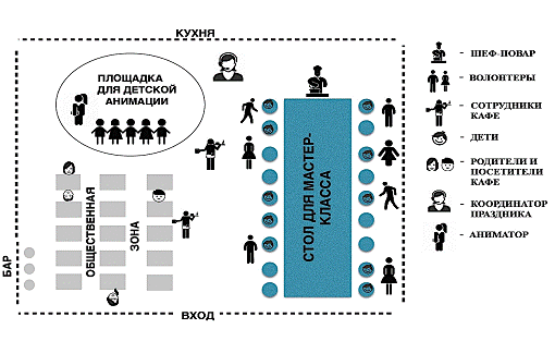 Детские мероприятия Handmade Charity проходят либо каждое, либо через одно воскресенье, как правило, в первой половине дня, преимущественно в утреннее время. Первыми приезжают волонтеры праздников Handmade Charity для того, чтобы заранее подготовить площадку до прихода детей: расставить столы, украсить площадку, все для мастер-класса, согласовать необходимое с поваром и персоналом кафе/ресторана. Время до начала праздника - это время волонтеров: они общаются друг с другом, пьют вместе кофе и параллельно готовят площадку к приходу детей и их родителей. По мере того, как гости начинают приходить, волонтеры рассредоточиваются: кто-то встречает гостей, кто-то осуществляет их навигацию. Родители, которым отведена отдельная зона отдыха, отдают детей волонтерам, которые, в свою очередь, до начала основного мастер-класса занимаются детьми либо совместно с приглашенным аниматором, либо совместно с другими волонтерами. По мере того как количество детей увеличивается и время подходит к началу мастер-класса от шеф-повара, волонтеры рассаживают детей вокруг стола, за которым будет проходить мастер-класс (см. рис. 2). Как правило, во время мастер-класса волонтеры присматривают за детьми или помогают им, официантам или шеф-повару, если это необходимо, общаются между с собой или с родителями, фотографируются. После мастер-класса, в течение того времени пока готовится тот или иной сделанный детьми продукт, начинается основная анимационная развлекательная программа для детей, которую проводит аниматор - в это время большинство детей полностью включено в игру и находятся под присмотром аниматора, но чаще всего наличие волонтеров и их участие в игре необходимо. Волонтеры включаются в игру - социокультурный процесс, который способствует позитивной динамике, делает, включенных в игру участников, активным участником происходящего социального процесса. Игровой формат мероприятия также дает возможность выйти за рамки обыденности и рутинности. Более того игра выполняет также коммуникативную и социализирующую практику, поскольку в процессе нее участники мероприятия общаются и обмениваются другими символами и знаками друг с другом, а социальная группа, сформированная на основе игры, позволяет преодолеть негативные последствия индивидуализации.