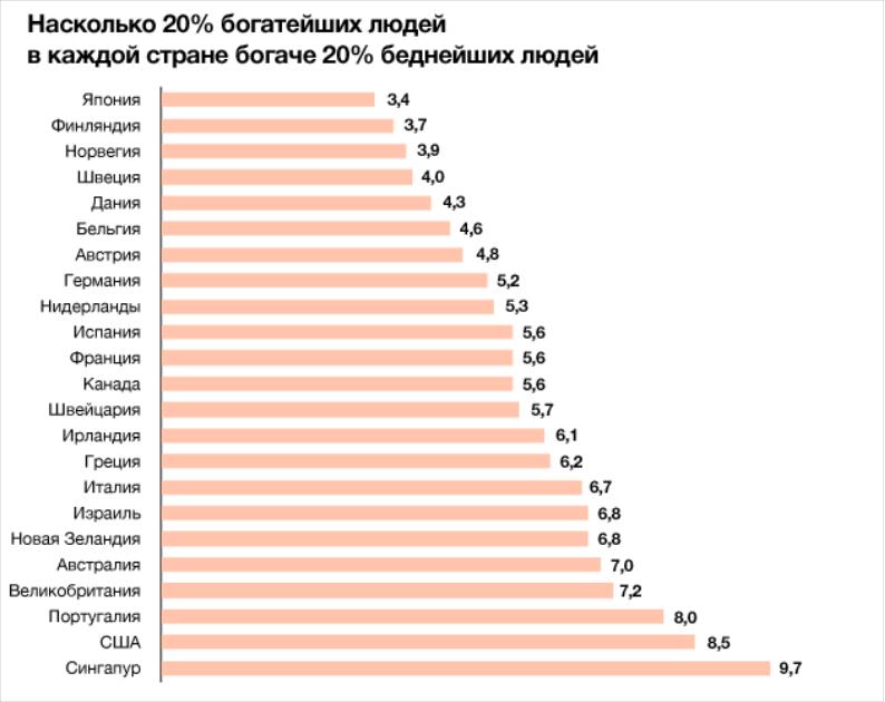 Из представленной диаграммы видно, что в США количество самых бедных в 8,5 раз превышает количество самых богатых В Сингапуре – в 9,7 раз, меньше всего расслоено общество в Швеции, Норвегии, Финляндии, Японии.