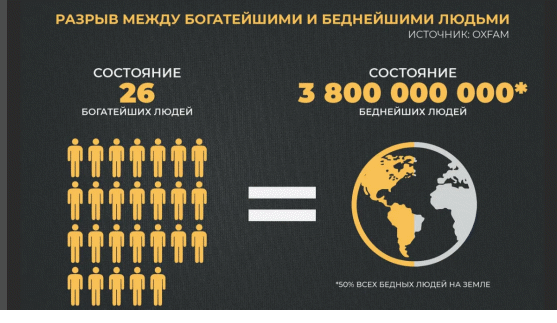 Данный рисунок наглядно демонстрирует масштабы разрыва между состоятельными и бедными людьми. Состояние всего двадцати шести самыми богатейших людей мира эквивалентно состоянию 3,8 млрд беднейших человек.