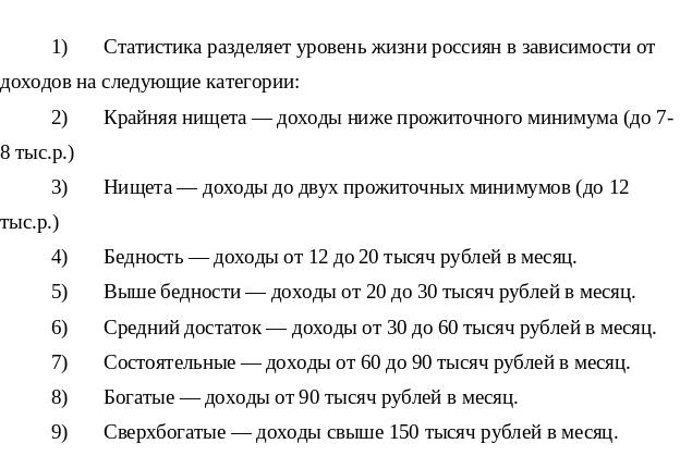 В России принята градация уровня жизни россиян в зависимости от доходов на следующие категории: