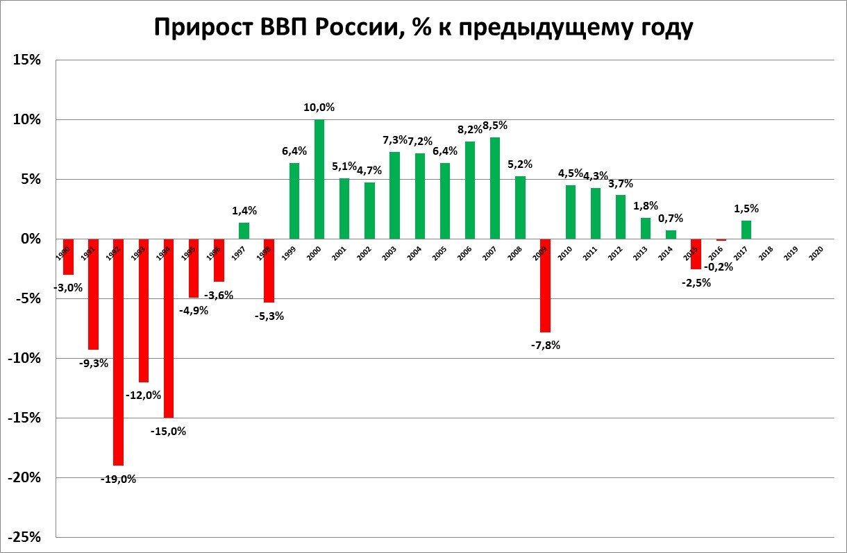 Рисунок 4. Динамика прироста ВВП в период с 1990 до 2020 года в России