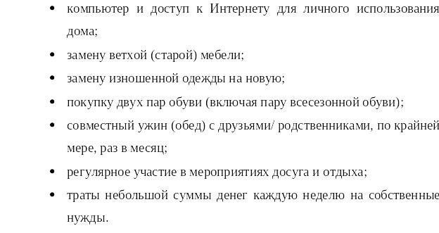 2) Лица, испытывающие серьезные материальные лишения (депривации) — граждане, живущие в условиях, при которых не могут себе позволить 4 любых наименования из списка из-за чего считающиеся малообеспеченными.