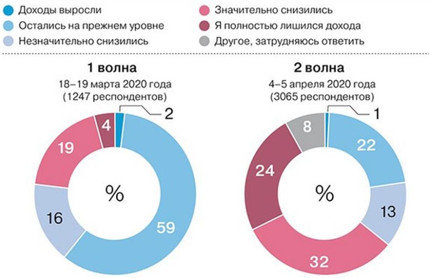 Из диаграмм видно, что если в начале года доходов полностью лишились 4% россиян, то к концу 2020 г. Без дохода осталось уже 24%, а значительно снизились доходы у 32% россиян. При этом поддержка от государства была оказана далеко не всем.