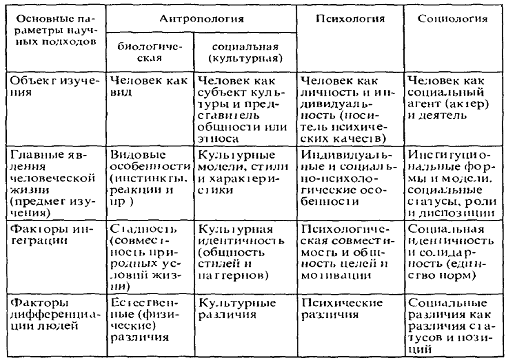 Разнообразие подходов в науках о человеке может быть проиллюстрировано следующей таблицей: