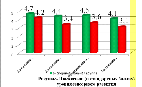 На гистограмме мы видим, что показатели сенсорного развития дошкольников, которые занимаются в группе сенсорного воспитания, на порядок выше, чем у дошкольников из группы, занимающейся по традиционной программе. В ней также уделяется внимание сенсорному развитию дошкольников, так как значимость сенсорики неоспорима в современной педагогики. И все-таки специально организованная среда, развивающие занятия делают уровень сенсорной культуры дошкольников из экспериментальной группы значительно более выраженным. Если в первой методике, ориентированной на выполнение всем знакомых заданий по складыванию мозаики, показатели группы традиционного обучения ненамного отличаются от экспериментальной группы, то различия становятся более выраженными на таких сложных заданиях, как дифференциация фонетического и фонематического звучания, идентификация объектов при прикосновении и наощупь.