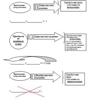 Таким образом, исходя из представленных схем, можно сделать важный вывод: приобретение имущества может быть как добросовестным, так и недобросовестным (в таком случае недобросовестность погашается сроком исковой давности по п. 4 ст. 234 ГК РФ), но вот если не будет добросовестного владения, то приобрести право собственности по приобретательной давности будет невозможно. При этом должны быть соблюдены условия срока, открытости и непрерывности владения.