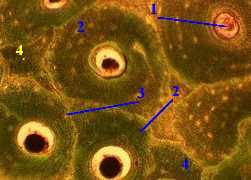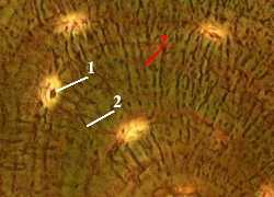 а) Здесь в поле зрения - центральный канал остеона, в котором проходит кровеносный сосуд (1). б) В этих каналах обычно содержатся и остеогенные клетки. |