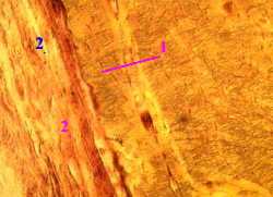 а) Снимок иллюстрирует строение первого из вышеназванных видов костной ткани. б) В грубоволокнистой костной ткани видны остеоциты (1) и толстые пучки оксифильных коллагеновых волокон без определённой ориентации (2) . |