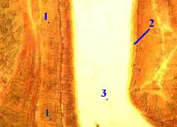 несколько концентрических слоёв костных пластинок (2), называемых остеонными. в) Остеоны отграничены резорбционной (спайной) линией (3). |