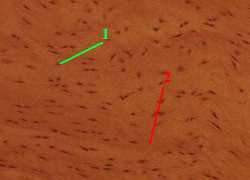 а) Костное вещество (клетки, волокна, основное вещество) организовано в пластинки. б) Причём, в пределах одной пластинки волокна имеют одинаковое направление, а в пределах соседних пластинок - разное. |