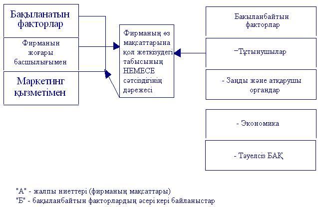 1-суреттен көрініп тұрғандай, фирманың маркетингтік ортасы бес бөлікке бөлінеді: бақыланатын факторлар, бақыланбайтын факторлар, фирманың өз мақсаттарына қол жеткізудегі табысының немесе сәтсіздігінің дәрежесі, бейімделу және кері байланыс.
