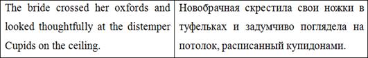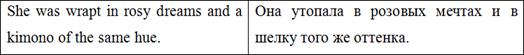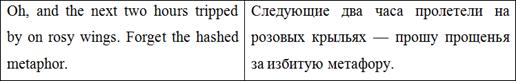 Е.Д. Калашникова в этом предложении сохраняет оригинальную метафору - ‘rosy wings’, однако меняет структуру текста, объединяя два простых предложения в одно сложное. Здесь особое внимание переводчик должен обратить на авторскую ремарку - характерную черту многих рассказов О. Генри. Однако в оригинале автор скорее просит «не обращать внимания на избитую метафору», в переводе Е.Д. Калашниковой используется словосочетание «прошу прощенья», что несколько искажает оригинальный смысл.
