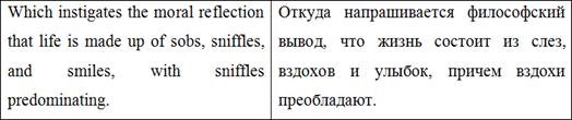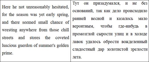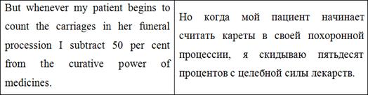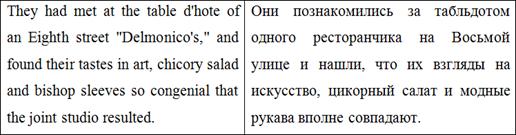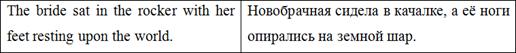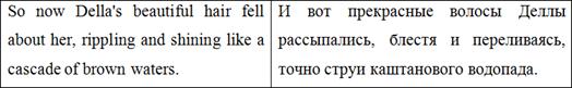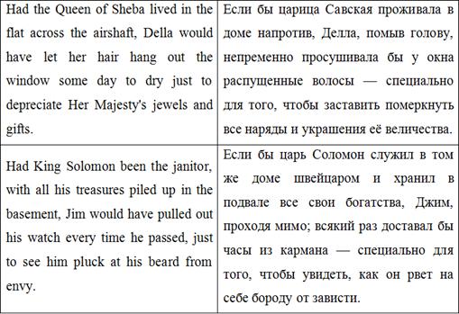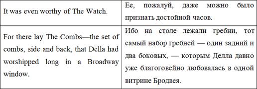 Также важно отметить авторскую вставку в данном абзаце ‘possibly bearing the privilege of exchange in case of duplication’. О. Генри рассказывает о волхвах возвышенным языком, говорит об их мудрости и щедрости. И, говоря о несомненной мудрости преподнесенных ими подарков, автор подмечает, что они «даже могут быть обменены в случае непригодности». Подобная вставка отвлекает внимание читателей от возвышенности повествования, созданной красивыми, высокими словами, возвращает нас «с небес на землю» и заставляет улыбаться. Подобные вставки являются одними из самых главных составляющих идиостиля О. Генри, и очень важно не потерять их при переводе.