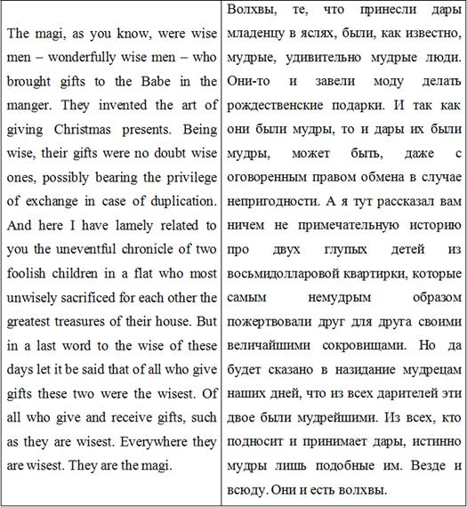 Но самая важная аллюзия, объясняющая название рассказа, находится в конце: О. Генри сопоставляет героев своего рассказа с волхвами, которые преподнесли мудрые и щедрые дары Иисусу. В героях рассказа мы видим величайшее самоотречение, готовность ради своей любви на любые жертвы. Простая человеческая любовь, которую автор возносит на высоту мудрости волхвов - это огромный подарок, который не купить ни за какие деньги. И при переводе очень важна точность в передаче смысла оригинального текста. В своем переводе Е.Д. Калашниковой удалось сохранить не только аллюзию, но также и форму и структуру предложений, тем самым очень точно передав оригинальный смысл.