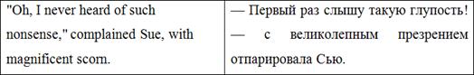 При описании речи Сью, О. Генри использует словосочетание ‘magnificent scorn’, что представляет собой авторский оксюморон -