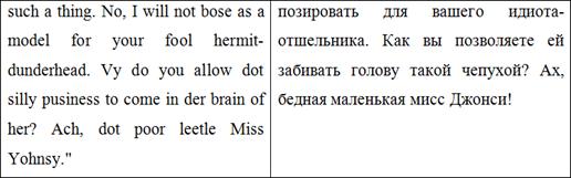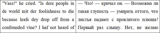 В этом рассказе О. Генри использует очень интересный прием - графон. В оригинале речь Бермана намеренно искажена, чтобы показать фонетические особенности, которые характеризуют его как представителя определенной социальной среды и диалекта, а также показать его индивидуальные особенности. В переводе Н.Л. Дарузес этот прием полностью отсутствует, из-за чего данный отрывок в тексте перевода теряет свою оригинальность и выразительность. На общее понимание текста данный прием практически не влияет, однако он представляет собой важную составляющую идиостиля О. Генри, поэтому это является важным упущением для переводчика.