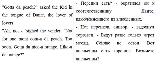 Как и в рассказе «Последний лист», О. Генри использует стилистический приём графон, чтобы показать представителя определенной социальной среды. Речь торговца намеренно искажена, чтобы показать фонетические особенности его произношения. В переводе Е.Д. Калашниковой этот прием полностью отсутствует, из-за чего данный отрывок в тексте перевода теряет свою оригинальность и выразительность. На общее понимание текста это практически не влияет, однако он представляет собой важную составляющую идиостиля О. Генри, поэтому это является важным упущением для переводчика.