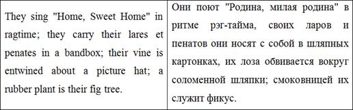 Однако в переводе М.Ф. Лорие использует более широкое понятие «Родина, милая родина». Также О. Генри говорит о «лозе» и «смоковнице», их часто выращивают во дворе дома, и здесь они символизируют стабильную и счастливую семейную жизнь. Автор использует данную метафору, чтобы показать стремление каждого человека к счастливой семейной жизни.