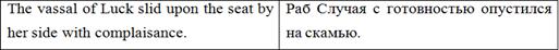 Метафора “The vassal of Luck” употребляется автором при описании молодого человека, когда он садится рядом с девушкой. Он подшучивает над главным героем, тем самым подчеркивая его бедственное положение, ведь на самом деле парень не знает еще, что разочаруется в знакомстве с девушкой. В переводе данная метафора была оставлена без изменений.